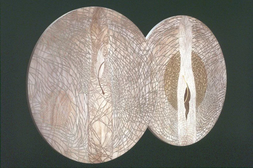 FOISONNEMENT DICHOTOME | Merisier gravé, encre; 2 cercles de 75cm de diamètre; 2000. Collection Loto-Québec