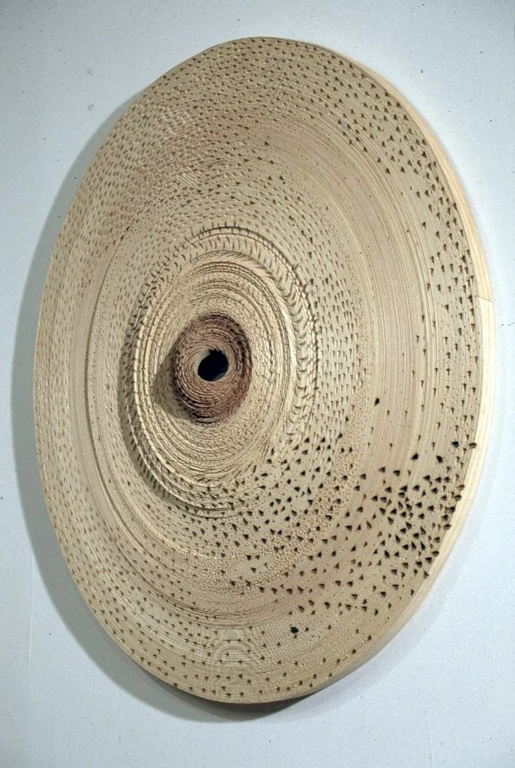 Interventions sous forme d'encoches de forme conique, piqûres regroupées en amas, teintes d'essences de bois... Mouvement, temps, espace et matière s'unissent dans une figure idéale, soit présentant une esthétique abstraite d'unité.